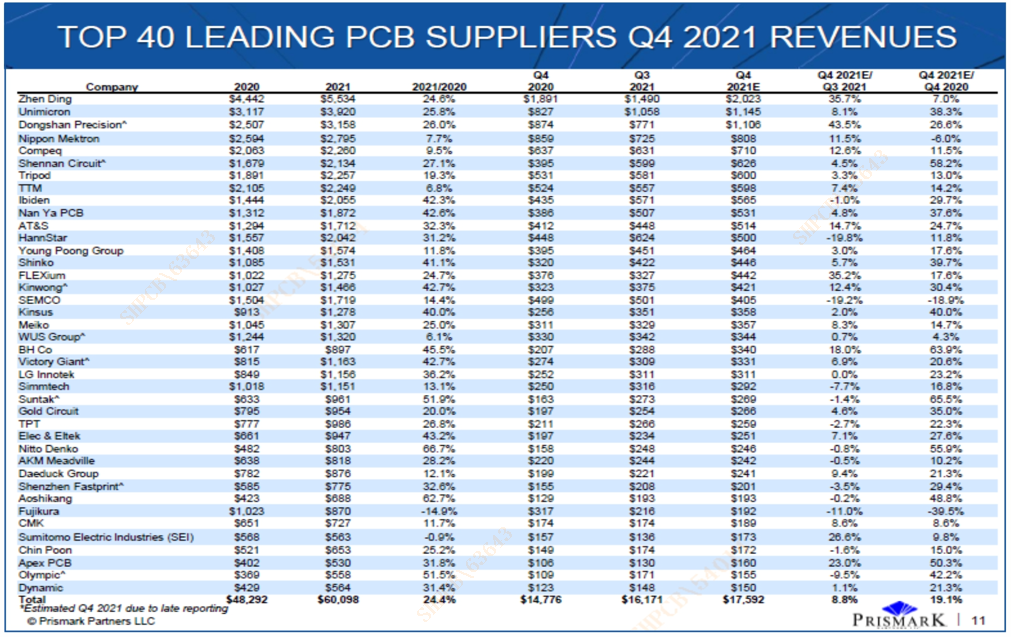 近期,国际知名电子行业咨询集团Prismark Partners发布2021年第四季度全球40强PCB企业排行榜与数据分析报告,共有七家内资企业上榜。其中,leyu.乐鱼科技在2021年第四季度全球PCB企业四十强排行榜中位列第22名,在内资PCB企业中位列第4名。